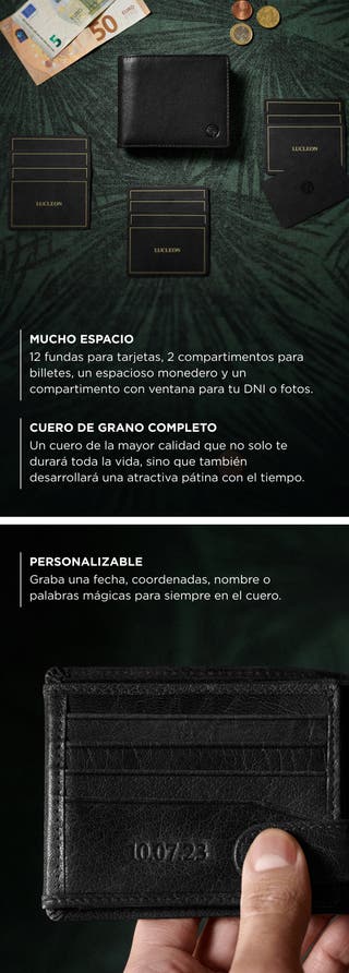 - Con capacidad para hasta 20 tarjetas, monedas y recibos