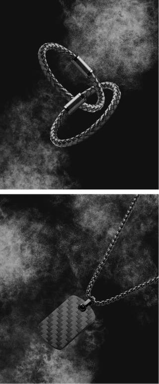 Acero inoxidable de grado quirúrgico y cuero auténtico con detalles de fibra de carbono. El acero está recubierto de carburo de titanio.